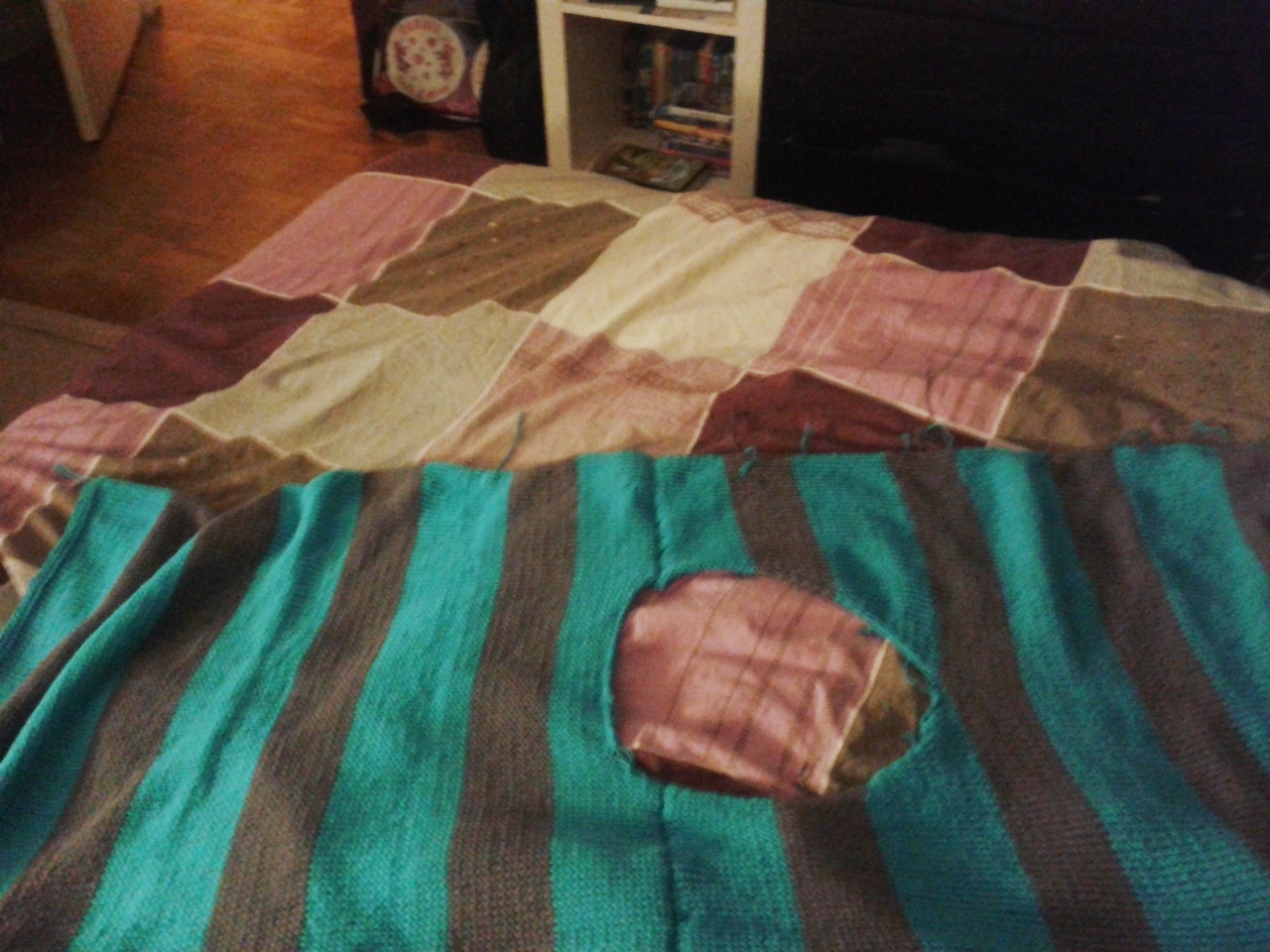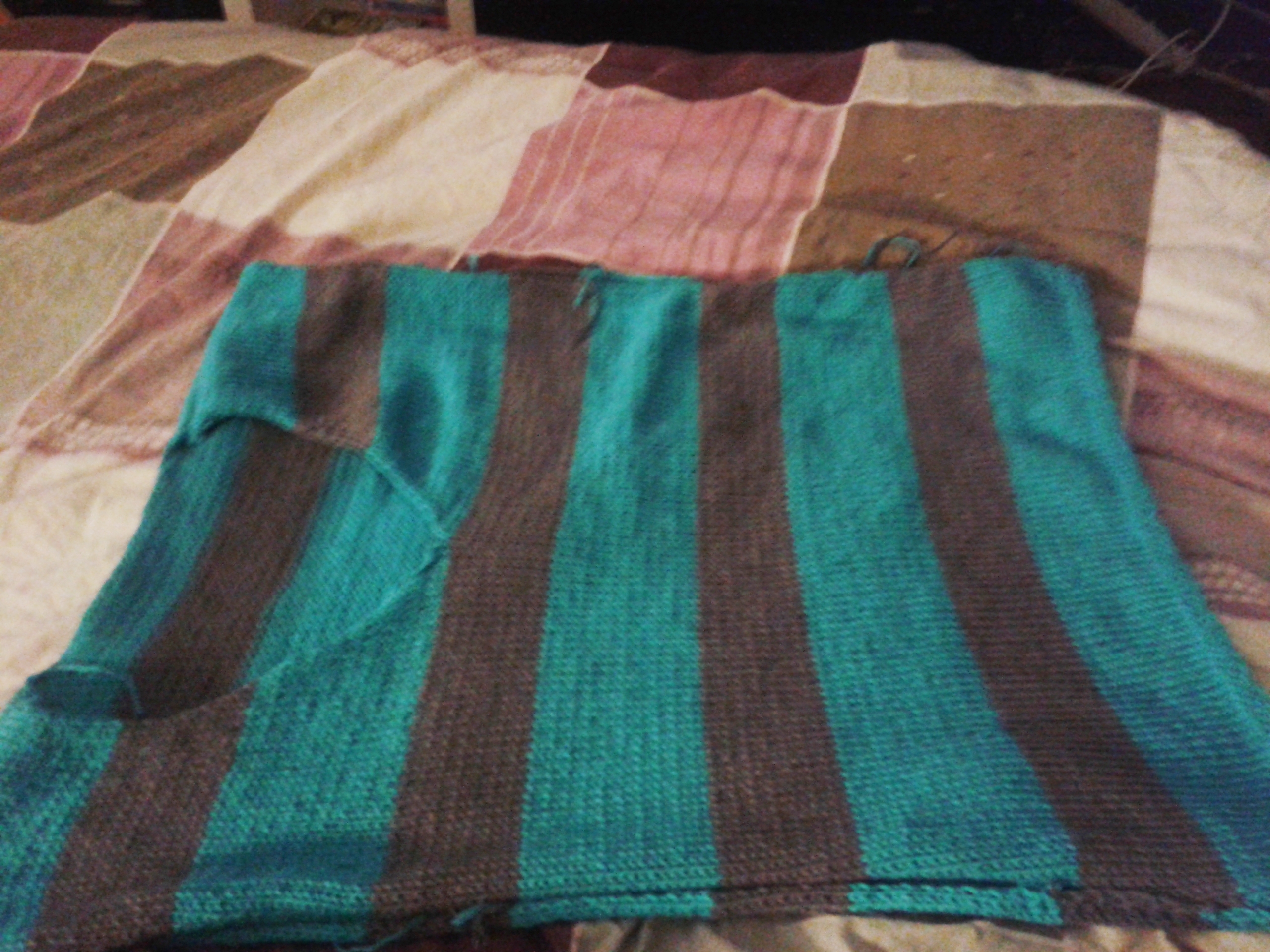 Travail en cours pour le petit Noël de ma maman (je mets les photos car c'est une commande, donc elle SAIT à quoi ça DEVRAIT ressembler). C'est le même modèle que mon pull à rayures mais avec les couleurs de mon pull bleu et gris, comme vous l'aurez subtilement remarqué vous-même. A l'heure actuelle il a même un col de plus, des fils qui traînent en moins et un début de manche droite, oui oui oui.