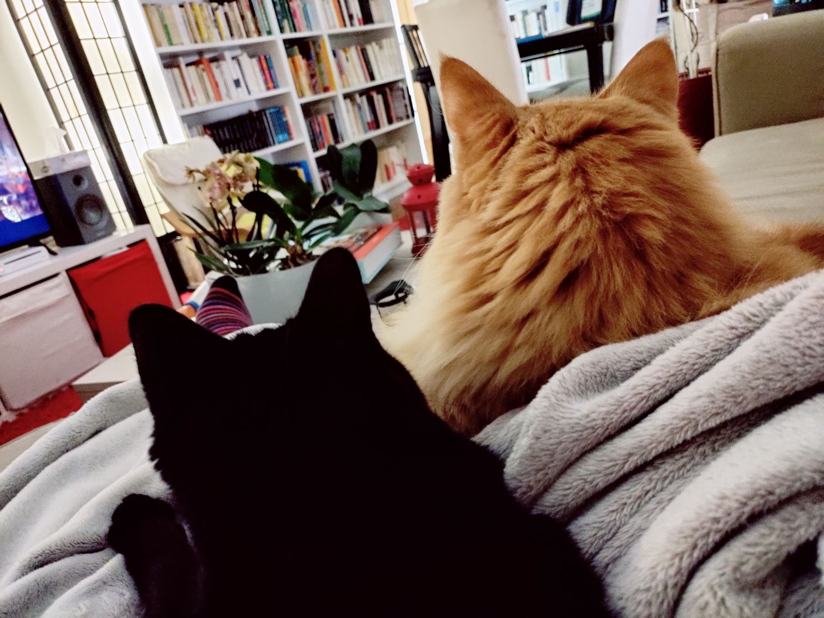 Mes girafes de chats [1] sont bloqués sur leur indignation. Nous avons donc misé sur une familiarisation progressive en bloquant à l'aide d'une chaussette la partie basculante suffisamment ouverte pour qu'ils puissent entrer ou sortir. Sauf que ce crétin d'ObiWan a fait tomber la chaussette et s'est retrouvé du mauvais côté de la porte, à son goût, à deux heures du matin. Grand bruit.